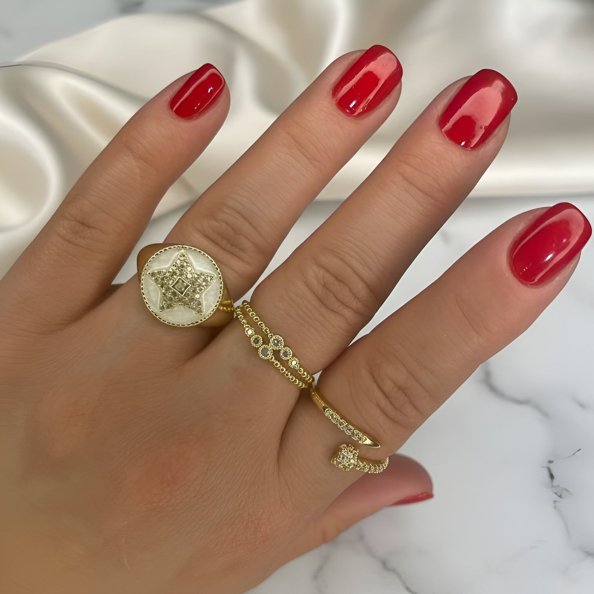 Celestial Glow Trio Yüzük Seti, gökyüzünden ilham alan zarif detayları modern hatlarla birleştirerek parmaklarda eşsiz bir uyum yakalar. İşaret parmağındaki büyük yıldız motifli plak yüxük, kombin setinin odak parçası olarak öne çıkar. Orta parmaktaki üçlü taş bant yüzük detaylı ve ince işçiliğiyle zarif bir geçiş sağlar. Yüzük parmağındaki açık form taşlı yüzük ise modern, sade ve ışıltılı görünümü tamamlar.