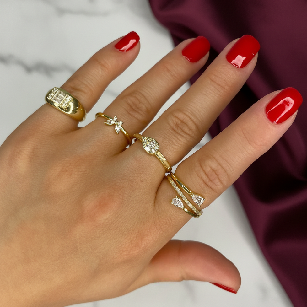 Golden Charm Yüzük Seti, modern zerafet ve romantik detayların mükemmel uyumuyla oluşturulmuş dört özel yüzükten oluşur. Geniş oval taşlı yüzük güçlü bir duruş sergilerken, kelebek detaylı ince yüzük kombine zarif bir hareket katar. Madalyon taşlı yüzük vintage bir etki sunar; serçe parmaktaki ikili damla taşlı açık yüzük ise modern ve minimal tasarımıyla seti kusursuz şekilde tamamlar.