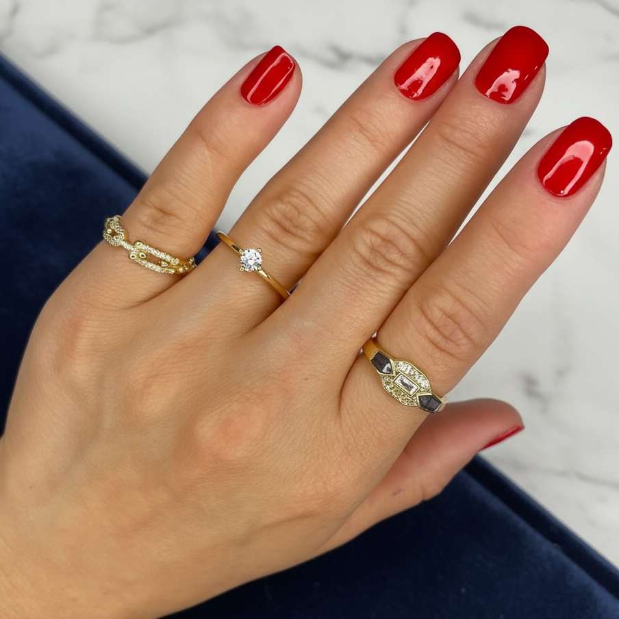 Golden Grace Yüzük Seti, zarif detayları sevenler için özenle bir araya getirilen üç farklı modelden oluşuyor. Floral taşlı yüzük modern ve romantik bir hava katarken, ince üç taşlı yüzük minimal şıklığı temsil ediyor. Retro oval yüzük ise zamansız ve karakterli bir dokunuş ekliyor.