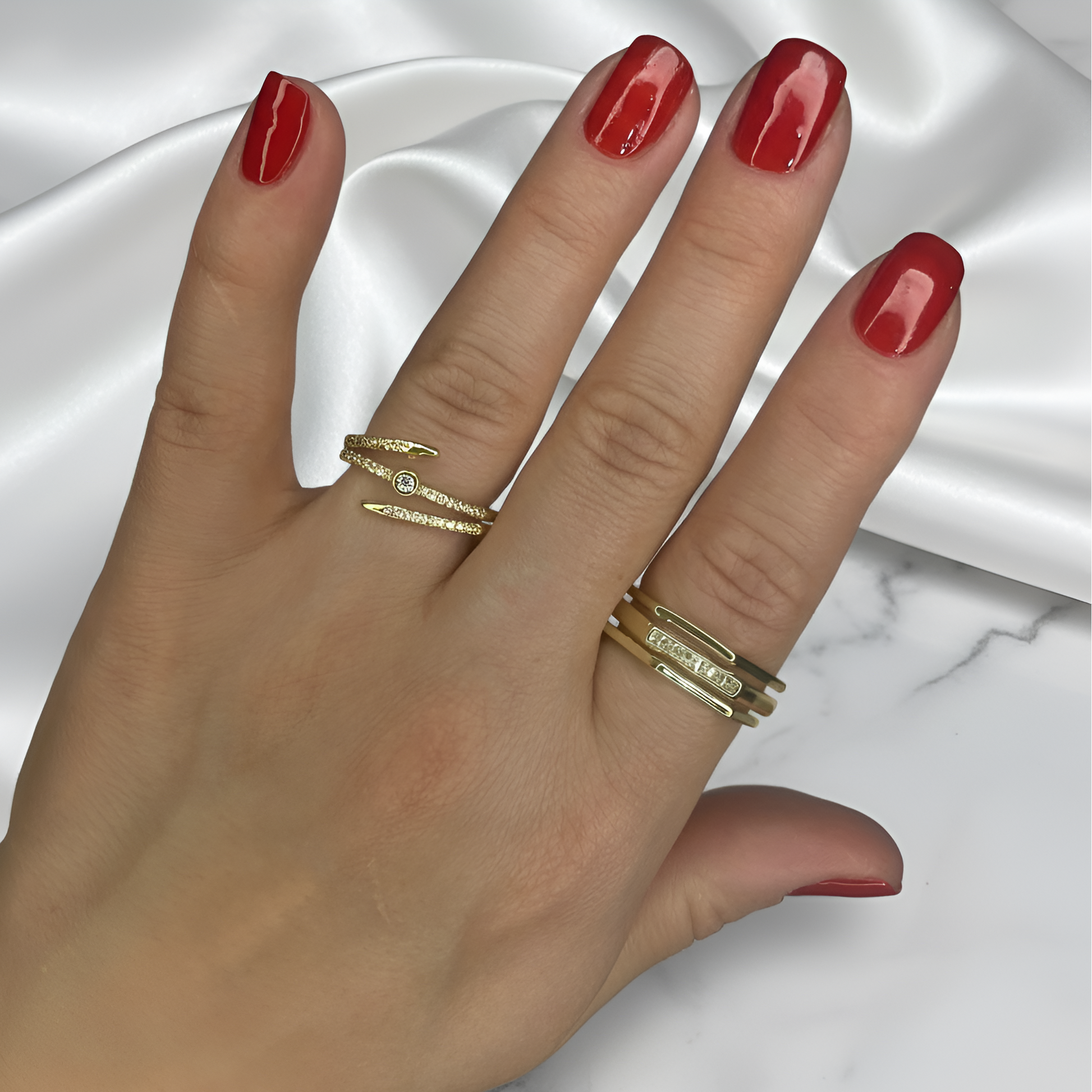 Modern Edge Duo Yüzük Seti, keskin hatlara sahip modern tasarımı zarif taş detaylarıyla birleştiren iki özel parçadan oluşur. Yüzük parmağındaki çift sarmal taşlı yüzük, parmağı sararak dikkat çekici bir ışıltı yaratırken; işaret parmağındaki üç bant minimal plaka yüzük, cool & modern bir görünüm sunar.