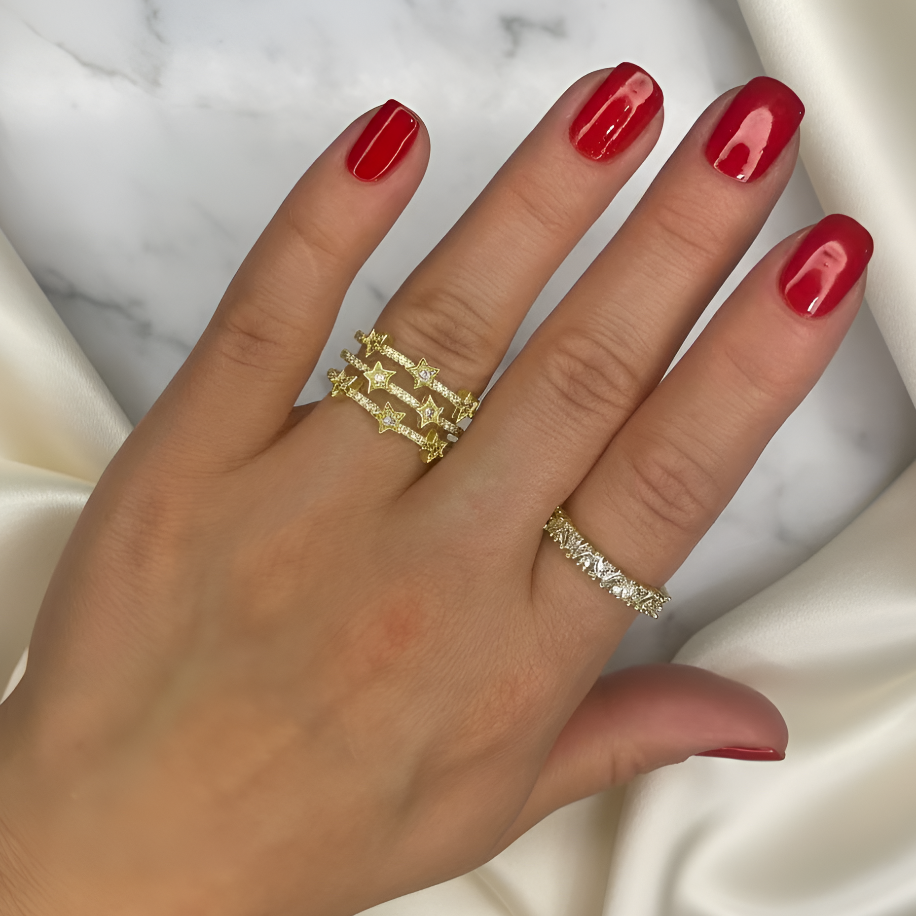 Stellar Glow 2’lI Yüzük Seti, yıldız silüetlerinin zarif ışıltısı etrafında tasarlandı. Yüzük parmağındaki çift kat yıldız yüzük güçlü bir statement görünüm oluştururken, işaret parmağındaki sıra taş bant yüzük ise tüm seti kusursuz bir parıltıyla tamamlar.