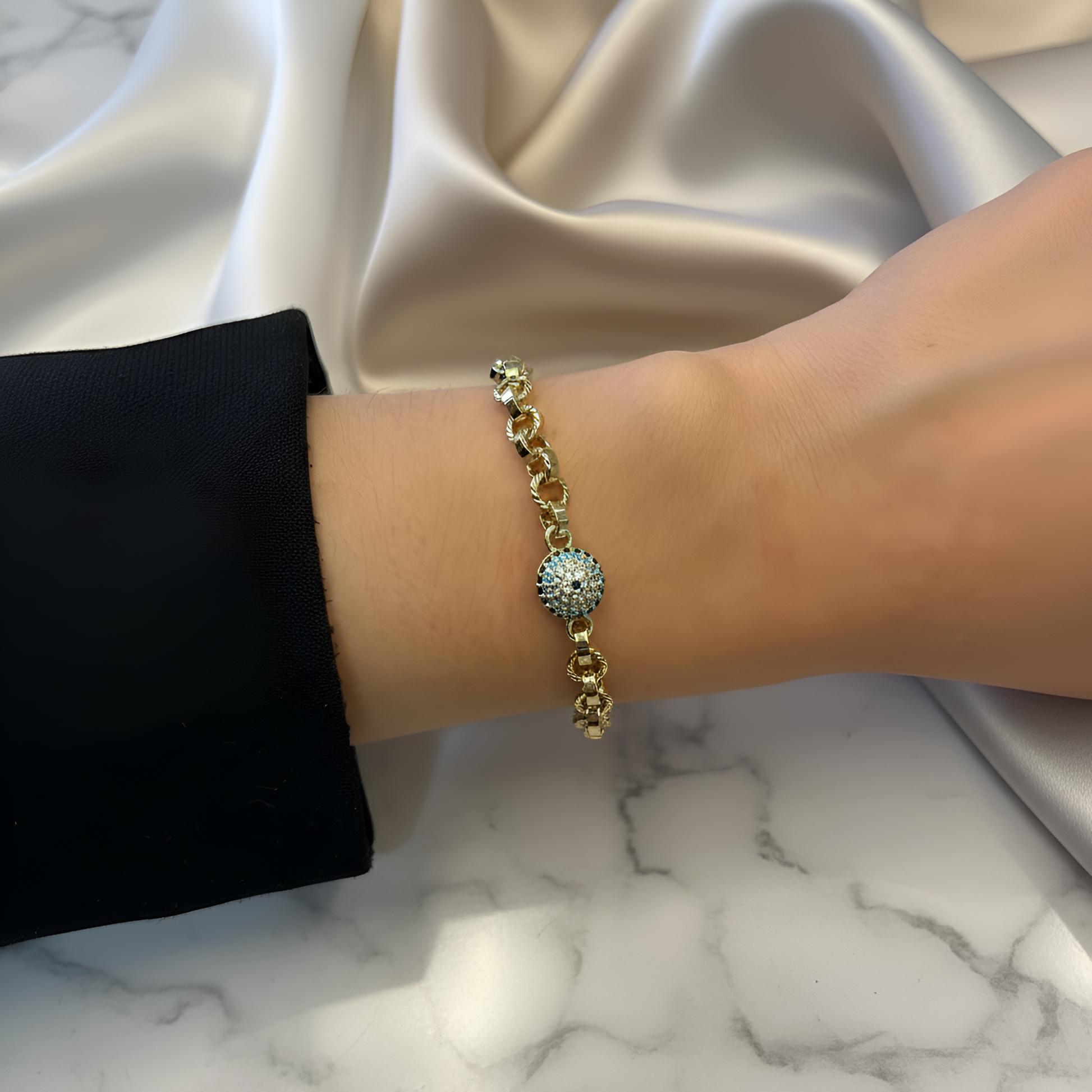 Turkuaz Taşlı Zincir Bileklik, modern zincir halkaları ve merkezdeki turkuaz taşlı ışıltılı detay ile bileğinizde sofistike bir dokunuş yaratır. Hem günlük kombinlerde hem de özel davetlerde zarif bir tamamlayıcı olarak öne çıkar. Hafif yapısı sayesinde gün boyu rahatlıkla kullanılabilir.